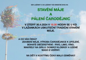 SDH Lažánky a OA Lažánky Vás srdečně zve na stavení máje a pálení čarodějnic, které se uskuteční v úterý 30.4.2024 v 16 h. u kulturního domu. Více viz. plakát: