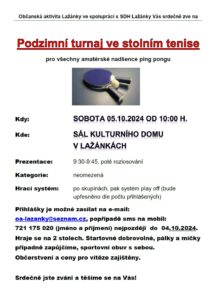 Občanská aktivita Lažánky ve spolupráci s SDH Lažánky zve všechny amatérské nadšence ping pongu na podzimní turnaj ve stolním tenise, který se uskuteční v sobotu 5.10.2024 v 10 h. v sále kulturního domu v Lažánkách. Podrobnosti viz. plakát: