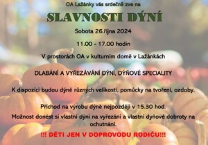 Občanská aktivita Lažánky vás srdečně zve na tradiční slavnosti dýní, které se uskuteční v sobotu 26.10.2024 v době do 11 h do 17 h. v prostorách občanské aktivity v kulturním domě v Lažánkách (vchod dole). Bližší informace viz. plakát:
