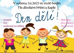 Občanská aktivita Lažánky a SDH Lažánky Vás srdečně zve na Den dětí, který se uskuteční v sobotu 3.6.2023 od 14 h u multifunkčního hřiště nad kaplí. Více informací viz. plakát: