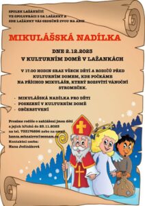 Občanská aktivita Lažánky, spolek Lažánečtí a SDH Lažánky Vás srdečně zve na Mikulášskou nadílku, která se uskuteční v sobotu 2.12.2023 v kulturním domě v Lažánkách. Více informací - viz. plakát.