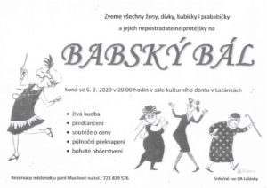 Občanská aktivita Lažánky Vás srdečně zve na Babský bál, který se uskuteční v pátek 6.3.2020 v 20 h. kulturním domě v Lažánkách. Rezervace místenek u paní Musilové na tel. 723 839 576