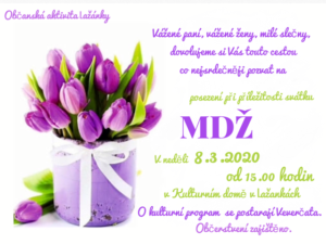 Občanská aktivita Lažánky srdečně zve všechny ženy a dívky, při příležitosti jejich svátku, na nedělní posezení, které se uskuteční v sále kulturního domu v Lažánkách 8.3.2020 v 15 hodin. O kulturní program se postarají naše Veverčata, občerstvení zajiště ...